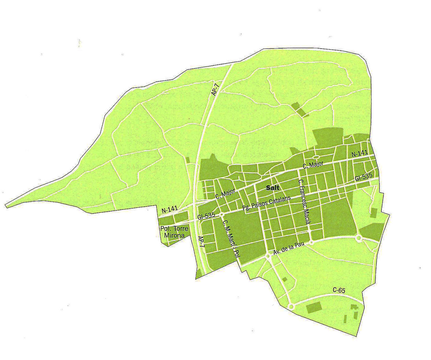 Dels 6,6 km2 que té Salt el 50% és nucli urbà (carrers i places, incloent-hi la zona del polígon) i l’altra meitat és sòl rústic, format principalment per la zona de les Deveses. La densitat de població se situa en 4.540 hab/km2.